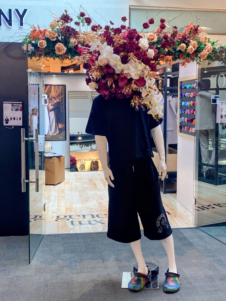 Our mannequin, affectionately nicknamed Manny, became the star of the install. His entire head was transformed into a luxury floral sculpture using my signature Wunderland Sweep — the bold diagonal flow of blooms that defines my style.