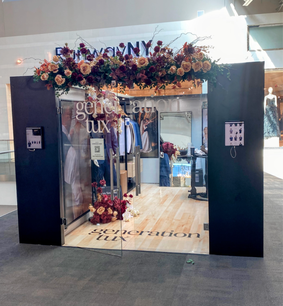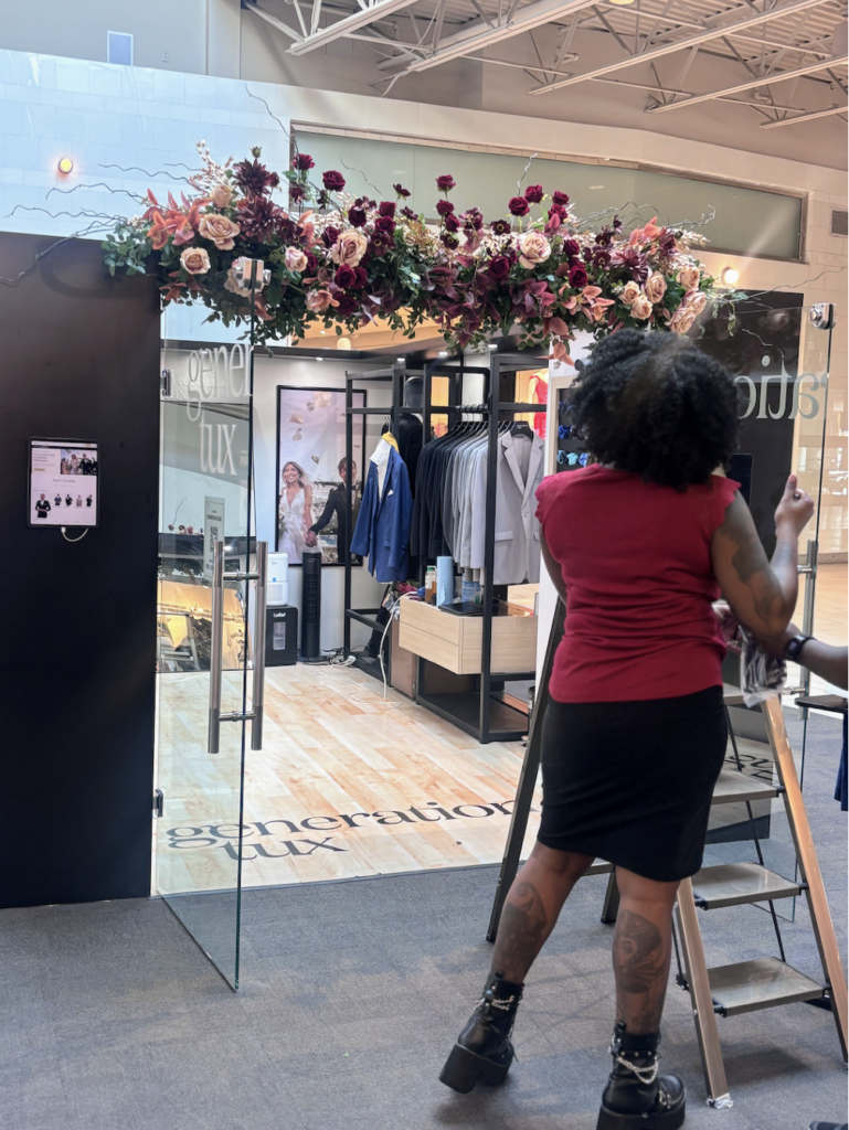 Of course, the installation wasn’t complete without a little fun. The Generation Tux Jersey Gardens Mall floral installation didn’t stop at the florals. We turned it into a full content experience. On social media, Manny became more than just a mannequin. He became a groom in need of a last-minute tux.